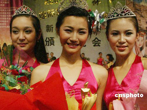 七月三十一日晚,“龜茲杯”2006國際旅游小姐新疆區(qū)總決賽在南疆阿克蘇市舉行,四十名入圍佳麗在決賽上展示泳裝、民族服飾以及晚裝,經(jīng)角逐來自烏魯木齊市的選手付苓獲得大賽冠軍(中)、梁爽獲得亞軍(右)、維吾爾族選手妮魯拜爾獲得季軍。作者:錢興強(qiáng)