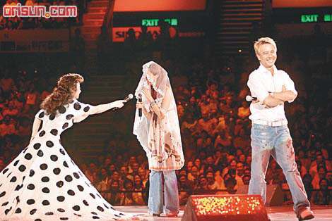 其后,小鳳姐工作人員把頭紗放在盧淑儀頭上,“命令”克勤站在女友身旁,然后把麥克風(fēng)放在克勤嘴邊說:“你愿意嘛?”又以同一番話詢問盧淑儀:“你又愿意嘛?”全場觀眾無不拍爛手掌和叫囂,雖然小鳳姐一番好意,但克勤卻顯得尷尬萬分,對她說:“我一路自居不結(jié)婚的,這是在樂壇屹立多年的秘訣!