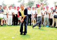 曾志偉是昨天一早先于明星隊(duì)伍到達(dá)現(xiàn)場的。前段時間一直坐在輪椅上的他已經(jīng)可以一瘸一拐地下地走路了,而且堅(jiān)持不讓別人攙扶,總算順利打出了漂亮的第一桿。