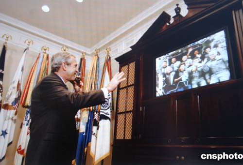 美國總統(tǒng)布什在白宮辦公室給太空中的發(fā)現(xiàn)號航天飛機(jī)機(jī)組打慰問電話。作者:賈國榮