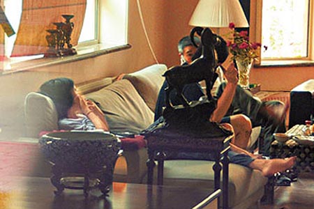 第二日,王菲與李亞鵬在第二日下午四時先起身,穿住T恤長褲,人字拖的王菲,與短衫短褲的李亞鵬由二樓睡房下到地下客廳,懶慵慵身貼身“攤”在巨型梳化上,“腳印印”看電視送“早餐”。由于二人婚前已同居一段時間,所以感覺相當老夫老妻。當發(fā)現(xiàn)有記者拍照時,王菲反應相當敏捷,即時通知老公,并用手掩面,因不防有此一招,原本吊在她腳尖上的人字拖,亦在慌忙中飛脫落地下。