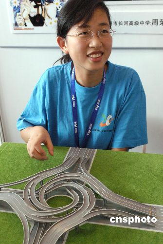 八月六日,杭州中學(xué)生周榮姝設(shè)計(jì)的互通式立交橋模型在北京舉行的“第二十屆全國(guó)青少年科技創(chuàng)新大賽”上展出。周榮姝的設(shè)計(jì)方案具有占地面積小、造價(jià)低、可靠性高的優(yōu)點(diǎn)。作者:鄒憲