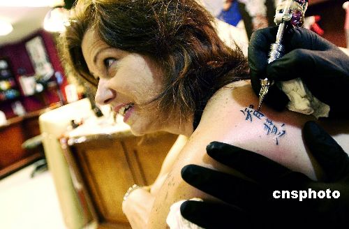 | 正在功讀心理學(xué)博士的美國(guó)人帕特麗夏女士八月將迎來(lái)四十四歲生日,她送自己一個(gè)獨(dú)具風(fēng)格的生日禮物——用漢字“智慧”兩字紋身。紋身在美國(guó)多元文化中非常普遍,許多人選擇漢語(yǔ)的詞或字符紋身,是因?yàn)闈h字的藝術(shù)可觀性并且充滿東方神秘感。美國(guó)的許多著名演員和歌手都紋身刺字,以此推廣為大眾化藝術(shù)。作者:陳鋼