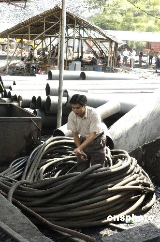 廣東興寧透水礦井十日加緊進(jìn)行抽水作業(yè)。需要三十個(gè)小時(shí)才能裝好的大功率潛水泵,經(jīng)工作人員的連續(xù)奮戰(zhàn),提前十四小時(shí)安裝完畢,于十日凌晨一次啟動(dòng)成功,目前井下水位以每小時(shí)一米的速度下降。圖為大功率潛水泵供電的大電纜每隔一段時(shí)間就要用水淋灑降溫。作者:羅仰明