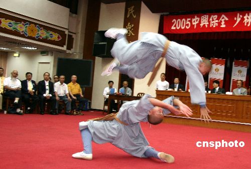 河南嵩山少林武僧團(tuán)一行十九人抵臺(tái)進(jìn)行武術(shù)觀摩交流活動(dòng)。圖為八月十二日,該團(tuán)武僧在“立法院”群賢樓舉行的記者會(huì)上表演對(duì)練,技驚四座。作者:董會(huì)峰