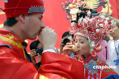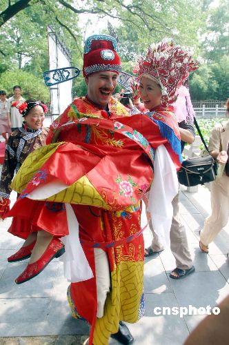 | 8月14日,濟(jì)南市大明湖景區(qū),來自荷蘭的楊文軒(Jan)先生與濟(jì)南姑娘黨妍舉行了一場傳統(tǒng)的中國式婚禮,婚禮上倆人按照中國的傳統(tǒng)習(xí)俗舉行了坐花轎、掀蓋頭、夫妻對拜等儀式。新娘黨妍今年28歲,2003年9月遠(yuǎn)赴荷蘭愛因霍芬科技大學(xué)學(xué)習(xí)計(jì)算機(jī)專業(yè),同年認(rèn)識了荷蘭小伙楊文軒(Jan),從此就開始了這段跨國姻緣。作者:龔輝