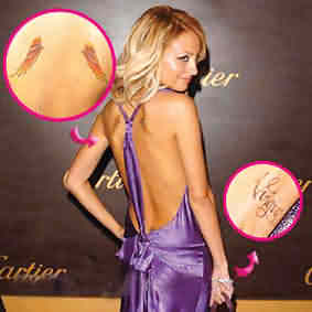 跟帕麗斯·希爾頓一塊出演真人秀《簡單生活》的妮可·里奇,文身也崇尚簡單,她的背上文了一對精巧的天使翅膀,右手腕上文了“Virgin”處女字樣,脖子上文了一個(gè)花環(huán)。