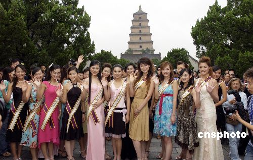 8月17日,參加西安“2005亞洲小姐總決賽”的20位內(nèi)地妙齡佳麗以及來(lái)自香港的12位選手和上屆冠軍呂晶晶、馮梓瑩一行抵達(dá)古城西安,并游覽了久負(fù)盛名的大慈恩寺,吸引了眾多中外游客。作者:侯智