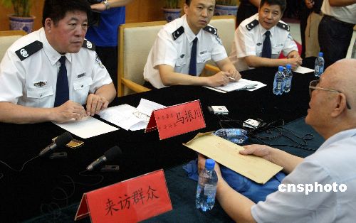 八月十八日,北京市公安局局長(zhǎng)馬振川(左)接待來(lái)訪的京城市民,傾聽來(lái)訪民眾反映的實(shí)際問(wèn)題。今天,北京警方共設(shè)立了二十個(gè)接待點(diǎn)集中接待來(lái)訪市民。作者:任海霞