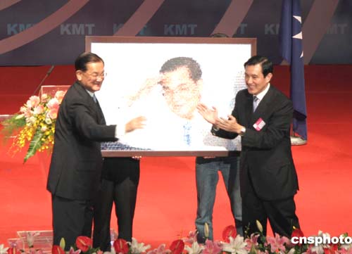 當(dāng)?shù)貢r(shí)間十九日上午,中國國民黨舉行主席交接儀式,連戰(zhàn)正式交棒給新任主席馬英九。連戰(zhàn)在交接現(xiàn)場(chǎng)收到黨部贈(zèng)送的“神秘禮物”——他自己的大幅拼貼照片。作者:趙海燕