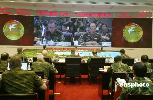 8月20日,參加聯(lián)合軍演的中俄雙方指揮員在導演部大廳觀摩第二階段演習。當日,“和平使命——2005”中俄聯(lián)合軍事演習第二階段——戰(zhàn)役籌劃階段在中國青島開始。作者:王麗南