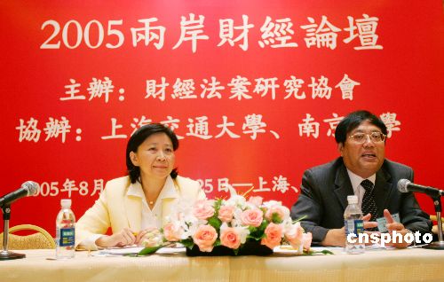 八月二十二日,“二○○五兩岸財經(jīng)論壇”在上海舉行,多名中國國民黨籍、親民黨籍“立委”以及三十多名臺灣金融界知名人士出席了本次論壇。圖為親民黨籍“立委”劉憶如(圖左)與上海交大安泰管理學(xué)院院長(右)王方華在本次論壇上。作者:湯彥俊