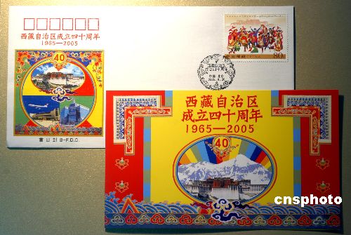 北京市郵票公司為配合國家郵政局于八月二十六日發(fā)行《西藏自治區(qū)成立四十周年》紀(jì)念郵票(一套一枚),特設(shè)計、印制了該郵票的首日封(上)、郵折(下)等郵品,并將于八月二十六日與郵票同時發(fā)行。郵票面值八十分。作者:鄒憲
