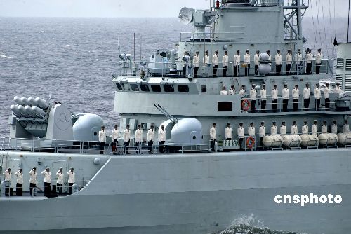 中俄聯(lián)合軍事演習(xí)海上封鎖演練中,演習(xí)的海軍艦艇接受檢閱,官兵向主席臺行閱兵禮儀。作者:王麗南