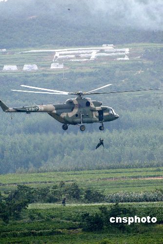 八月二十四日,“和平使命—2005”中俄聯(lián)合軍事演習第三階段兩棲登陸作戰(zhàn)實兵演練在山東半島展開。圖為中國特戰(zhàn)隊員實施繩降。作者:王麗南
