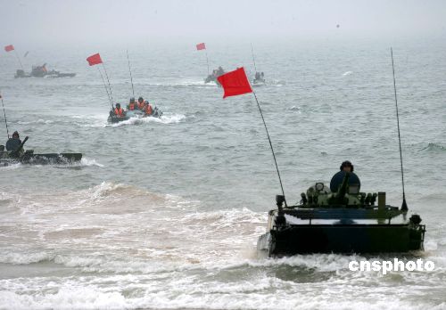 八月二十四日,“和平使命—2005”中俄聯(lián)合軍事演習(xí)第三階段兩棲登陸作戰(zhàn)實(shí)兵演練在山東半島展開,參加兩棲登陸作戰(zhàn)實(shí)兵演練的中國海軍陸戰(zhàn)隊(duì)水陸坦克向岸邊突擊。作者:王麗南