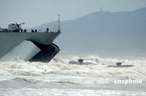 八月二十四日,盡管山東半島天氣惡劣“和平使命—2005”中俄聯(lián)合軍事演習(xí)兩棲登陸作戰(zhàn)實(shí)兵演練如期進(jìn)行。圖為參加兩棲登陸作戰(zhàn)演練的俄羅斯陸戰(zhàn)隊(duì)乘裝甲車劈浪向岸邊靠近。作者:王麗南