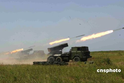 8月25日,參加強制隔離實兵演習的中方部隊多管火箭炮向目標發(fā)起攻擊。當日上午,“和平使命——2005”中俄聯(lián)合軍事演習最后一個戰(zhàn)術(shù)行動課目——強制隔離作戰(zhàn)演練在濟南軍區(qū)濰北靶場舉行。作者:王麗南