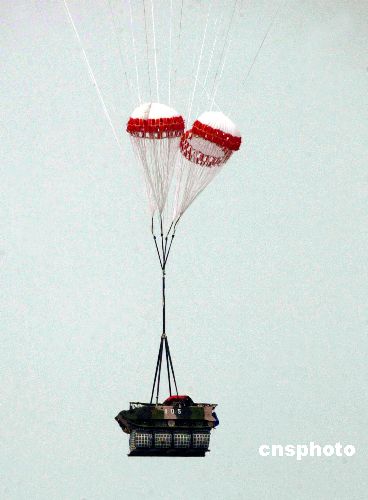 圖為中國空軍運輸機空投裝甲戰(zhàn)車,裝備底部的防震墊清晰可見。作者:王麗南