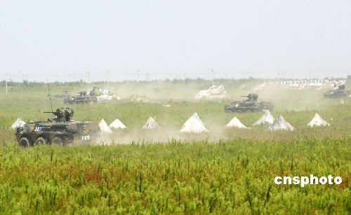 “和平使命——2005”中俄聯(lián)合軍事演習(xí)強(qiáng)制隔離演練8月25日在在山東半島舉行。圖為聯(lián)合演習(xí)部隊(duì)裝甲車密集炮火攻擊敵機(jī)場,消滅機(jī)場頑敵。作者:王麗南