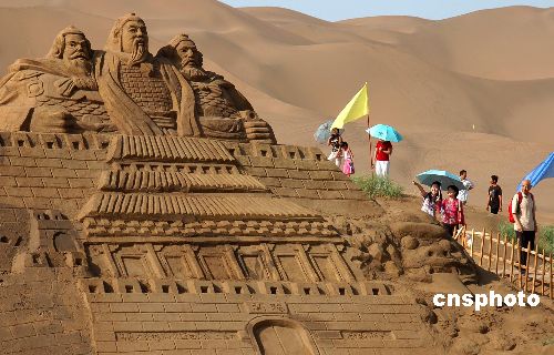 8月27日,幾名游客在欣賞沙雕作品。第二屆中國(guó)沙雕藝術(shù)節(jié)在新疆鄯善縣庫(kù)木塔格沙漠沙雕城開(kāi)幕,共有12組反映新疆歷史文化、民風(fēng)民俗的沙雕作品向游人開(kāi)放。作者:劉健
