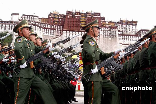 八月二十八日,西藏自治區(qū)成立四十周年大型游行彩排活動在拉薩舉行,圖為西藏武裝警察部隊方隊走過拉薩布達拉宮廣場。作者:張宇