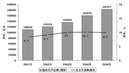圖表一 “十五”期間國內(nèi)生產(chǎn)總值及其增長(zhǎng)率