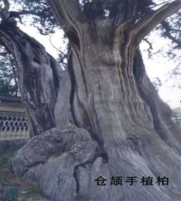 “倉(cāng)頡手植柏”是廟內(nèi)最古老的柏樹。此柏腰圍7.28米,根圍9.3米,高17米,林業(yè)專家斷定它足有五千年樹齡。它完全可以同“黃帝手植柏”相媲美。相傳當(dāng)年倉(cāng)頡選中這個(gè)墓穴后,便在此處栽植了這棵柏樹,所以叫“倉(cāng)頡手植柏”。