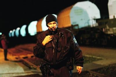 11月8日,在德國丹嫩貝格,一名防暴警察在運載核廢料的列車旁工作。
