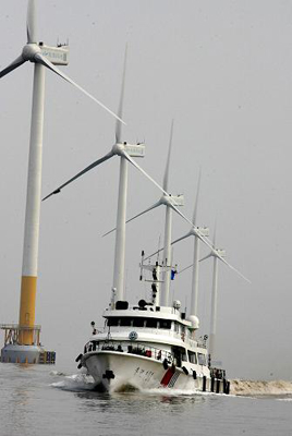2月22日,上海海事局洋山海事處的巡邏艇正在安裝了風(fēng)力發(fā)電機(jī)的海域巡視。上海東海大橋100兆瓦海上風(fēng)力發(fā)電示范工程,是我國(guó)第一個(gè)由國(guó)家發(fā)改委正式核準(zhǔn)并列為示范項(xiàng)目的大型海上風(fēng)電項(xiàng)目,也是亞洲首座海上風(fēng)力發(fā)電場(chǎng),目前海上34臺(tái)風(fēng)機(jī)安裝已進(jìn)入尾聲,預(yù)計(jì)于今年5月1日前并網(wǎng)發(fā)電。
