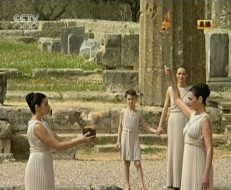 在希臘奧委會(huì)主席艾東尼斯向劉淇贈(zèng)送奧運(yùn)圣火的火種罐后,奧運(yùn)圣火取火儀式于當(dāng)?shù)貢r(shí)間十一時(shí)四十分在赫拉神廟前進(jìn)行。八分鐘后,擔(dān)任最高女祭司的希臘著名演員瑪利亞·娜芙普利都通過(guò)凹面鏡點(diǎn)燃手中的取火火炬,北京奧運(yùn)圣火采集獲得圓滿成功!