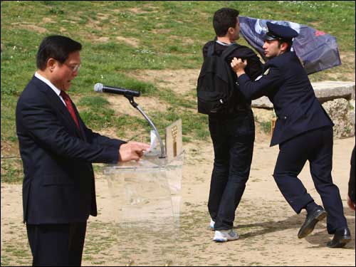 上午十一點,圣火采集儀式正式開始。陽光明媚,暖風(fēng)習(xí)習(xí),古競技場內(nèi)綠草茵茵,春花爛漫,一切都顯得生機(jī)盎然,現(xiàn)場氣氛神圣而祥和。儀式進(jìn)行了十幾分鐘,北京奧組委主席劉淇上前開始發(fā)表講話,這時,記者看見來賓席上突然躥出一個人,他奔向劉淇,在劉淇身旁展開一個橫幅,另有兩個顯然是他同伙的人也加入進(jìn)來發(fā)難。但他們迅即被在場的希臘警察制服,并被帶離現(xiàn)場。在這一不到兩分鐘的過程中,劉淇繼續(xù)沉穩(wěn)莊嚴(yán)地發(fā)表講話,未受到任何影響。當(dāng)劉淇主席講話結(jié)束和會場傳來北京奧運(yùn)圣火在赫拉神廟前已點燃的消息時,整個現(xiàn)場響起了雷鳴般的掌聲,在場的人們用這種方式表達(dá)了對奧運(yùn)的熱愛和對北京奧運(yùn)會的祝福。整個儀式按既定程序進(jìn)行,那場小鬧劇也成了全世界愛好和平、熱愛奧運(yùn)的人們的笑柄。