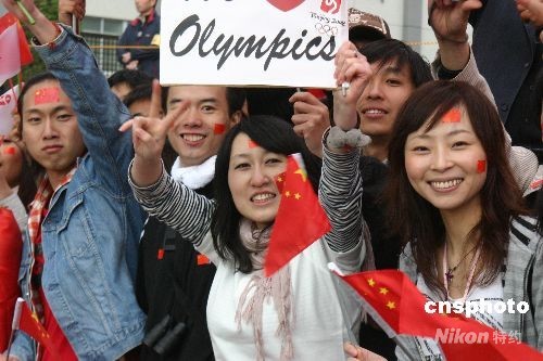 圖為中國留學(xué)生為北京奧運圣火沿街助威。 中新社發(fā) 沈晨 攝
