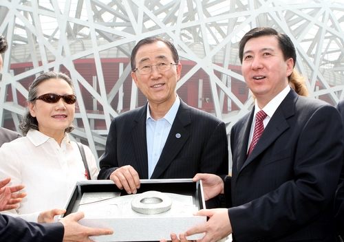 國(guó)家體育場(chǎng)運(yùn)行團(tuán)隊(duì)負(fù)責(zé)人張建東(右)向潘基文(中)及其夫人(左)贈(zèng)送“鳥巢”模型。