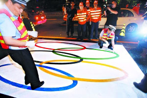 昨晚9點(diǎn),記者在三元橋下出京方向看到,一塊約6米見(jiàn)方的白色色塊被粘在車道上,施工人員用卡尺畫出奧運(yùn)五環(huán)標(biāo)志的輪廓,然后再鋪上黑、綠、紅等彩條。