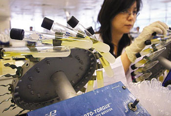 香港賽馬會賽事化驗所七月七日開放予傳媒參觀,職員在處理藥檢樣本時會為樣本編碼,以確;灩ぷ鹘^對客觀。該化驗所斥資超過六千萬港元購置先進設備,包括二十五臺質(zhì)譜分析儀,為奧運參賽馬匹的液體樣本進行違禁藥物測試。 中新社發(fā) 古治茵 攝