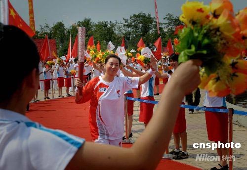 7月14日,奧運(yùn)火炬在吉林長春傳遞。圖為長春末棒火炬手速滑健將王春露跑向傳遞終點(diǎn)。中新社發(fā) 廖攀 攝