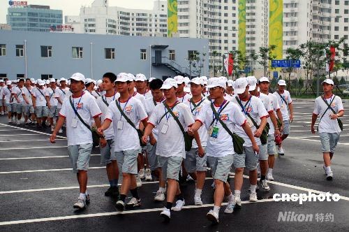 7月15日早上,駐京海軍某部300名官兵身著統(tǒng)一服裝到鳥巢參加奧運(yùn)開幕式彩排。據(jù)了解,北京奧組委采取嚴(yán)格的保密措施防止開幕式節(jié)目內(nèi)容泄露,為此“鳥巢”外圍戒備森嚴(yán),共有三層隔離護(hù)欄,由公安、武警把守!傍B巢”上空的制高點(diǎn)也被全面封鎖,防止高空偷拍。 中新社發(fā) 楊慧峰 攝