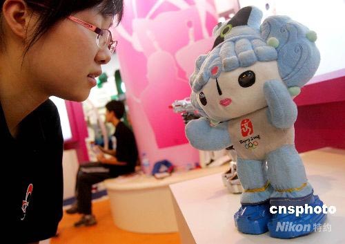 7月15日,在上海科技館舉行的2008上海國(guó)際青少年科技博覽會(huì)上,一款?yuàn)蕵?lè)型語(yǔ)音控制機(jī)器人“福娃”亮相,吸引不少好奇的目光。據(jù)介紹,該款福娃機(jī)器人不僅能與人對(duì)話,還能回答與奧運(yùn)會(huì)相關(guān)的問(wèn)題。中新社發(fā) 湯彥俊 攝