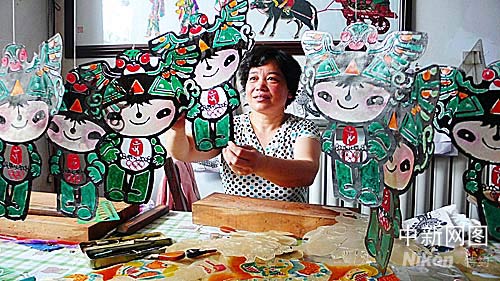 “山西省民間藝術(shù)大師”趙翠蓮雕刻出奧運(yùn)福娃系列皮影,表達(dá)了山西人對(duì)奧運(yùn)的期盼和祝福。 馮文芳 攝