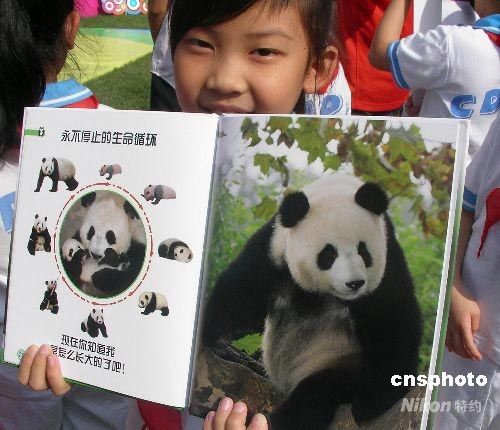 7月16日上午,全球首本由奧運(yùn)大熊貓“晶晶”擔(dān)任主角的科普圖書——《我是晶晶-熊貓成長寫真》中文版在成都大熊貓繁育研究基地舉行了全球首發(fā)儀式。該書歷時(shí)兩年策劃、設(shè)計(jì),由企鵝集團(tuán)著名的多林金德斯利公司著,童趣出版有限公司編譯,人民郵電出版社出版發(fā)行。為表達(dá)對震后四川、成都的關(guān)愛,該書的全球首發(fā)儀式安排在成都舉行。中新社發(fā) 楊杰 攝