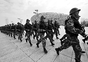 “服從命令、聽從指揮、忠于職守、英勇善戰(zhàn)……”昨日上午9時,鳥巢與水立方之間的廣場上,武警北京總隊某部1500名官兵代表緊攥右拳,向國旗和國際奧委會會旗宣誓。奧運期間,這支武警部隊將負(fù)責(zé)奧運最核心區(qū)域、賽事的警衛(wèi)及處突反恐工作,是北京賽區(qū)任務(wù)最重、用兵量最大、投入安保時間最長的部隊。