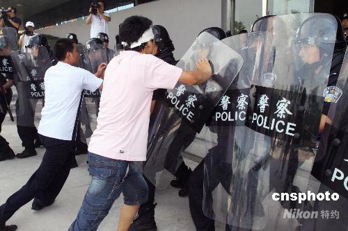 奧運(yùn)村法庭舉行奧運(yùn)安保演練。發(fā)生“突發(fā)事件”時(shí),法警使用盾牌將鬧事“當(dāng)事人”與遭到圍攻的法官分隔開(kāi)。中新社發(fā) 劉新 攝