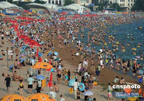 青島第一海水浴場(chǎng)游泳的游人爆滿。經(jīng)過(guò)一個(gè)多月的全力奮戰(zhàn),困擾2008北京奧運(yùn)會(huì)帆船賽舉辦地青島的近海滸苔已得到了有效的清除和遏制,奧帆賽訓(xùn)練比賽場(chǎng)地和海水浴場(chǎng)又恢復(fù)了往日的熱鬧景象。中新社發(fā) 曲連遵 攝