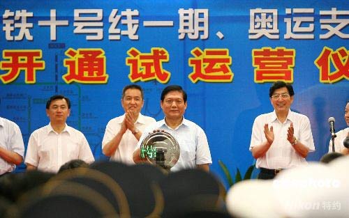 7月19日,北京地鐵10號(hào)線(一期)、奧運(yùn)支線、機(jī)場(chǎng)線開(kāi)通試運(yùn)營(yíng)儀式在地鐵10號(hào)線與奧運(yùn)支線交匯的北土城站舉行。中共中央政治局委員、北京市委書記、北京奧組委主席劉淇啟動(dòng)三條地鐵線路。 中新社發(fā) 富田 攝
