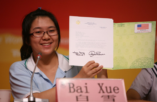 中新網(wǎng)7月21日電 一名來(lái)自北京市八一中學(xué)的普通女生白雪,受到學(xué)校一次假期作業(yè)的啟發(fā),給各國(guó)總統(tǒng)寫(xiě)了宣傳北京綠色奧運(yùn)的信件。目前,她已收到了包括法國(guó)總統(tǒng)薩科齊、韓國(guó)前總統(tǒng)盧武鉉、德國(guó)總理默克爾、澳大利亞前總理霍華德等元首寄回的三十余封回信。