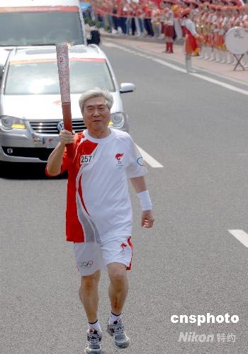 圖為神州飛船(1到5號)總設計師戚發(fā)軔在青島傳遞奧運火炬。 中新社發(fā) 廖攀 攝