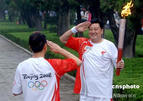 7月22日上午,奧運火炬在山東曲阜傳遞,兩位火炬手交接時互敬軍禮。 中新社發(fā) 廖攀 攝