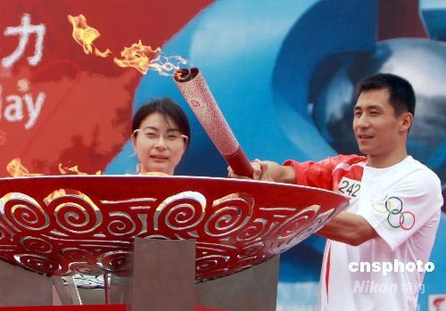 奧運(yùn)火炬在山東濟(jì)南傳遞,中國跳水隊(duì)現(xiàn)役運(yùn)動(dòng)員郭晶晶、王峰共同傳遞濟(jì)南最后一棒火炬并點(diǎn)燃圣火盆。中新社發(fā) 廖攀 攝