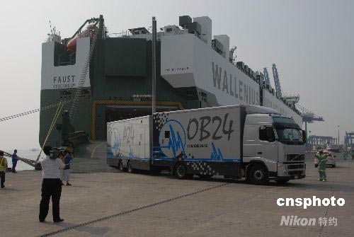 7月24日,瑞典籍大型滾裝船舶“弗斯特”號裝載的58輛高清電視轉(zhuǎn)播車在天津港滾裝碼頭接卸上岸。這批世界上最為先進(jìn)的電視轉(zhuǎn)播車來自英國、法國、比利時等6個國家,它們將全部被用于北京奧運(yùn)會的電視轉(zhuǎn)播。 中新社發(fā) 胡志強(qiáng) 攝